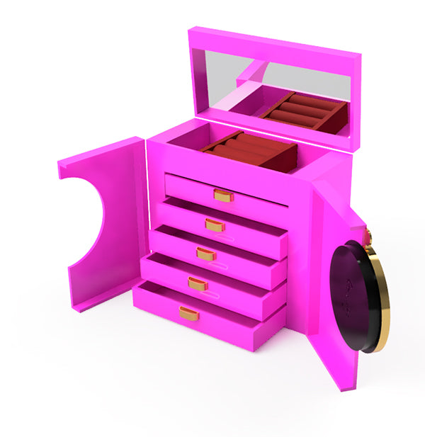 Introducing our Pink Jewelry Box Clock - a perfect blend of style and functionality. This beautifully crafted clock not only keeps time but also serves as a stunning jewelry box with 5 drawers and a ring/accessory space at the top. The 'soft glow' clock face adds a touch of elegance, making it a perfect addition to any bedroom or dressing room. Made with top-quality materials, this jewelry box clock is a must-have for any jewelry enthusiast.